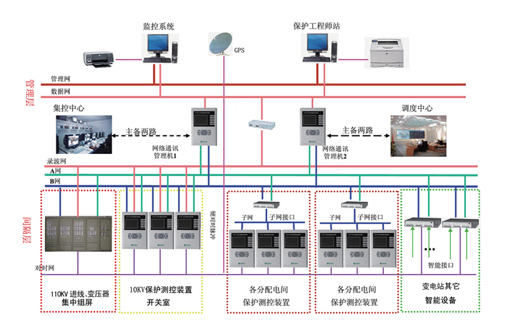 ■ 分层:该系统分间隔层和站控层两层,层与层之间相对独立,通过具有冗余结构的前置层(通讯管理机)设备连接通信。间隔层设备包括保护设备、数据采集、控制设备及指示显示部分等。站控层设备包括工控机、综合自动化监控软件,可组单机网络,也可组多机热备用网络。站控层通过通信管理机与间隔层通信,实现站级协调、优化控制和当地监控;同时实现与远方调度中心的通信。既可完成RTU四遥和远程接入功能,也可直接进入上一级调度网络。