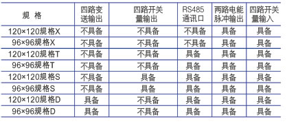仪表有多种扩展功能模块可供选择: 4路模拟量(0-20mA/4-20mA)输出可实现电量的变送输出功能;4路开关量输入和4路开关量输出可实现本地或远程的开关信号监测和输出功能, 一路RS485通讯接口, 采用MODBUS-RTU通讯协议,实现与PLC、工控计算机等通讯组网。用户可根据实际需求选择最为经济的功能配置。
