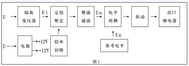 本继电器为静态型继电器,采用进口集成电路构成;被测量的交流电压U~经隔离变压器降压后得到与被测电压成正比的电压Ui,经整定后进行整流,整流后脉冲电压经滤波器滤波,得到与Ui成正比的直流电压Uo,在电平检测中Uo与直流参考电压Ue进行比较,若直流电压Uo低于参考电压,电平检测器输出正信号,驱动出口继电器,则本继电器处于动作状态。反之,不论是过电压继电器或是低电压继电器,若直流电压Uo高于参考Ue,电平检测器输出负信号,本继电器处于不动作状态。